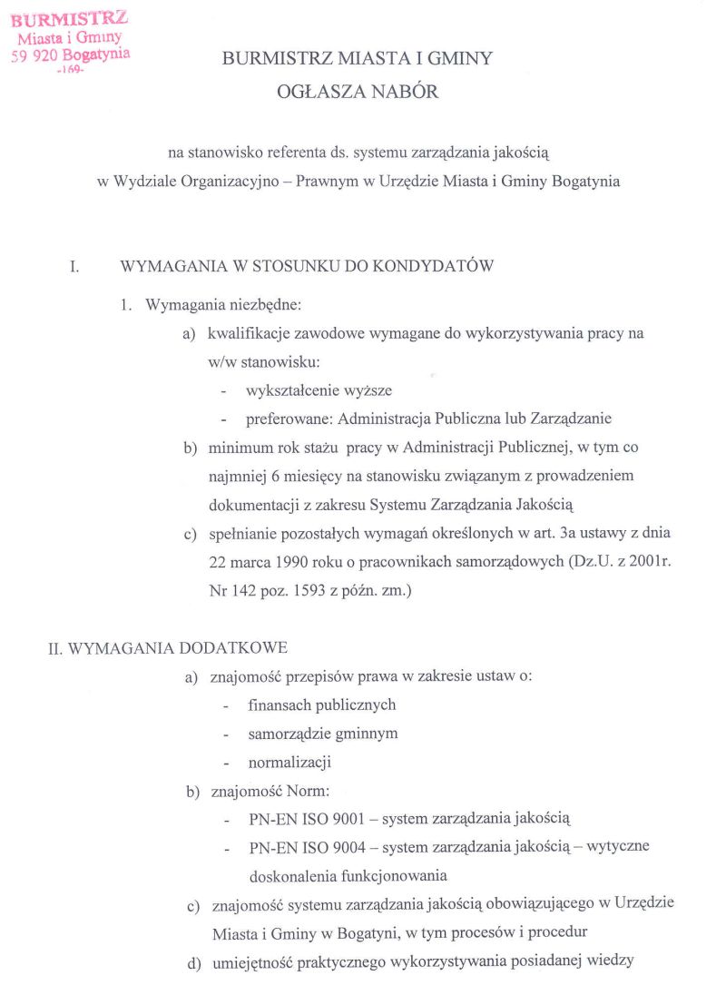 Całość ogloszenia o norze na stanowisko referenta ds. systemów zarządzania jakością umieszczone jest w Załącznikach do pobrania poniżej