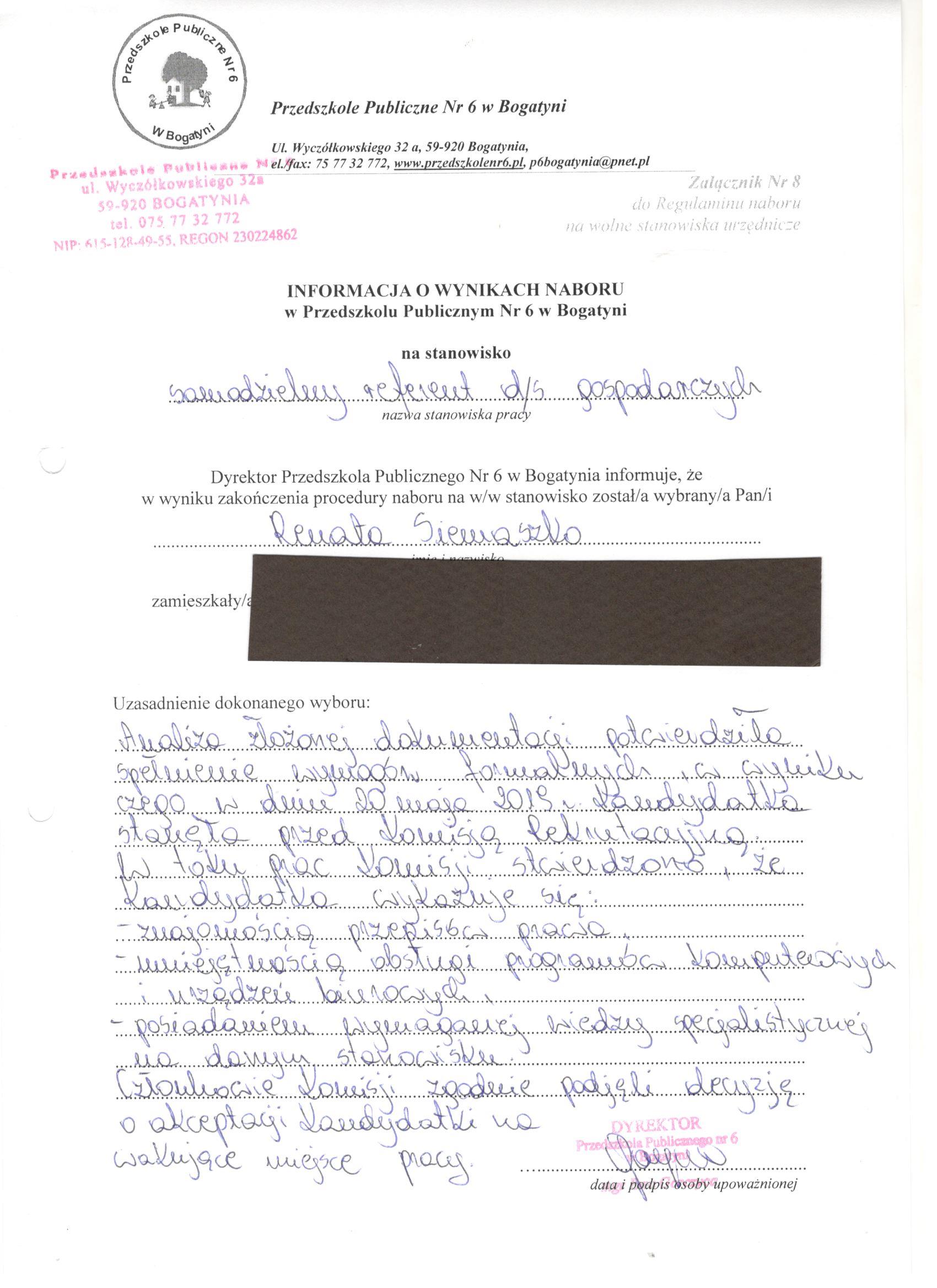4. Informacja o wyniku naboru będzie umieszczona na stronie internetowej Biuletynu Informacji Publicznej      oraz na tablicy informacyjnej w Przedszkolu Publicznym Nr 6. Dodatkowe informacje można uzyskać        pod numerem telefonu 75 77 32 772.
