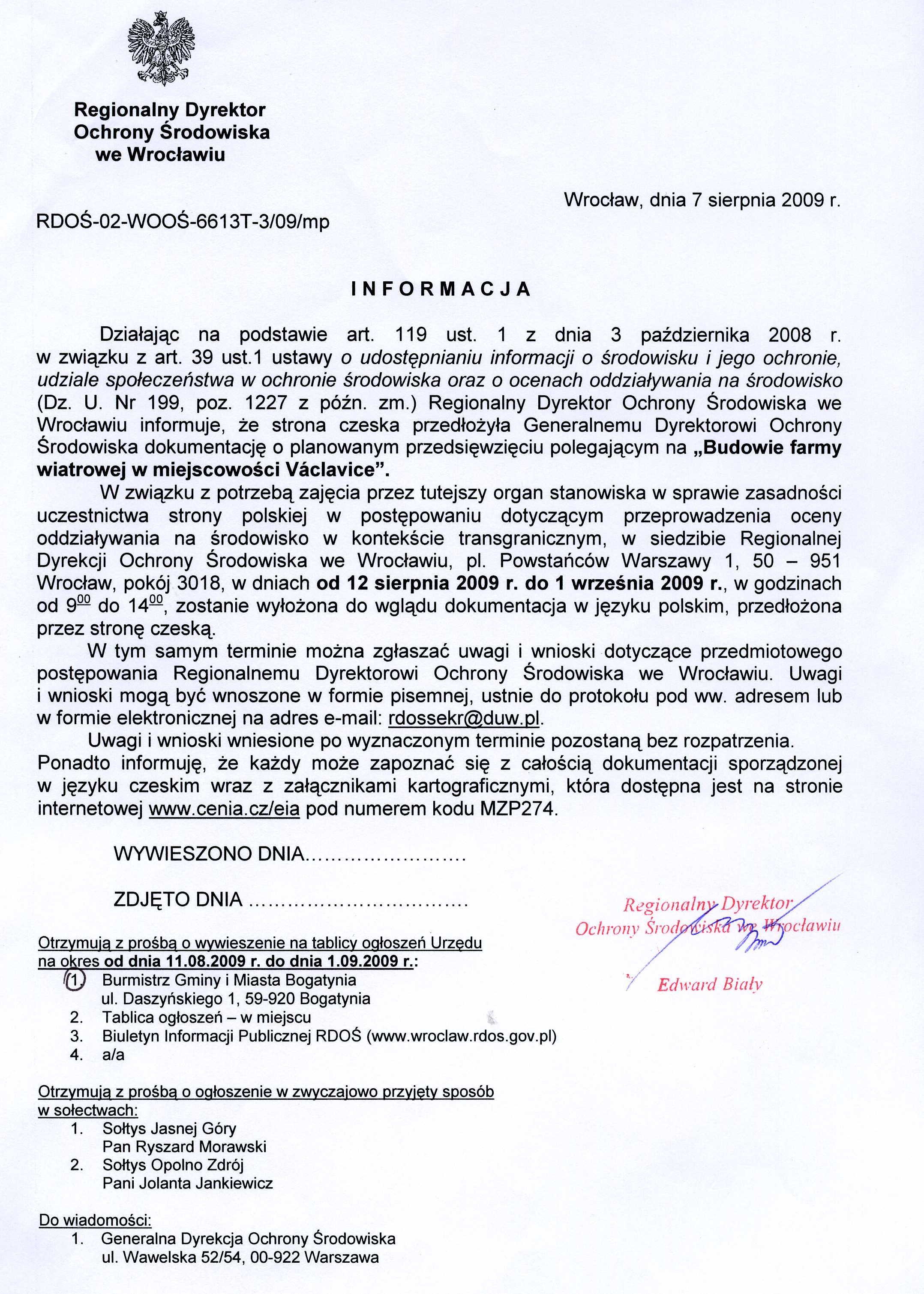 Działając na podstawie art. 119 ust. 1 z dnia 3 października 2008 r. w związku z art. 39 ust.1 ustawy o udostępnianiu informacji o środowisku i jego ochronie, udziale społeczeństwa w ochronie środowiska oraz o ocenach oddziaływania na środowisko (Dz. U. Nr 199, poz. 1227 z późn. zm.) Regionalny Dyrektor Ochrony Środowiska we Wrocławiu informuje, że strona czeska przedłożyła Generalnemu Dyrektorowi Ochrony Środowiska dokumentację o planowanym przedsięwzięciu polegającym na „Budowie farmy wiatrowej w miejscowości Vaclavice".