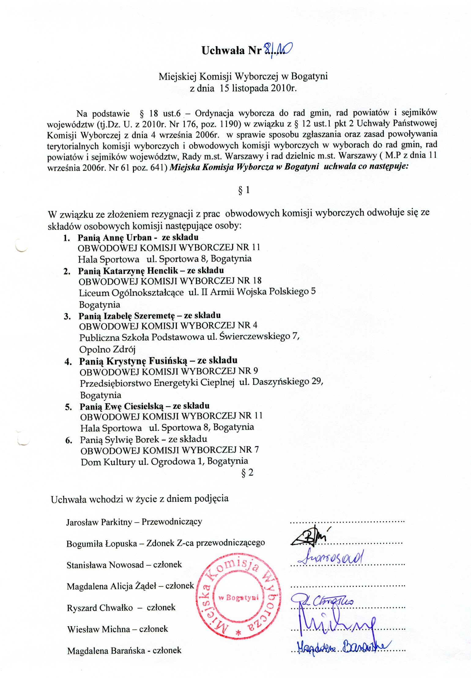 Miejskiej Komisji Wyborczej w Bogatyni z dnia 15 listopada 2010r.