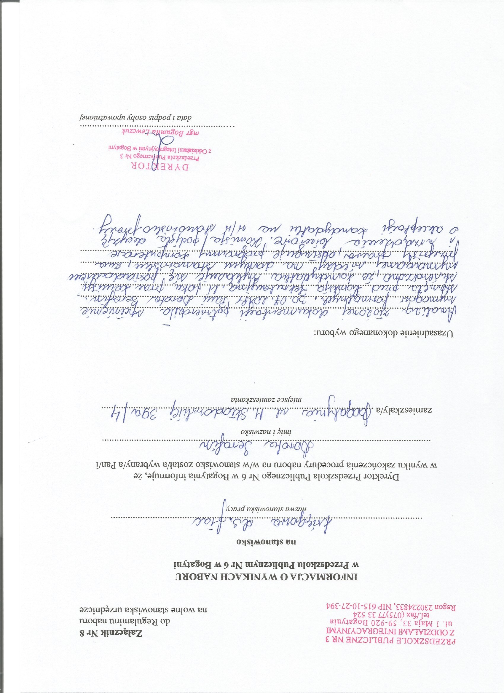 4. Informacja o wyniku naboru będzie umieszczona na stronie internetowej Biuletynu Informacji Publicznej oraz na tablicy informacyjnej w Przedszkolu Publicznym Nr 3 z Oddziałami Integracyjnymi w Bogatyni. Dodatkowe informacje można uzyskać pod numerem telefonu 75 77 33 524