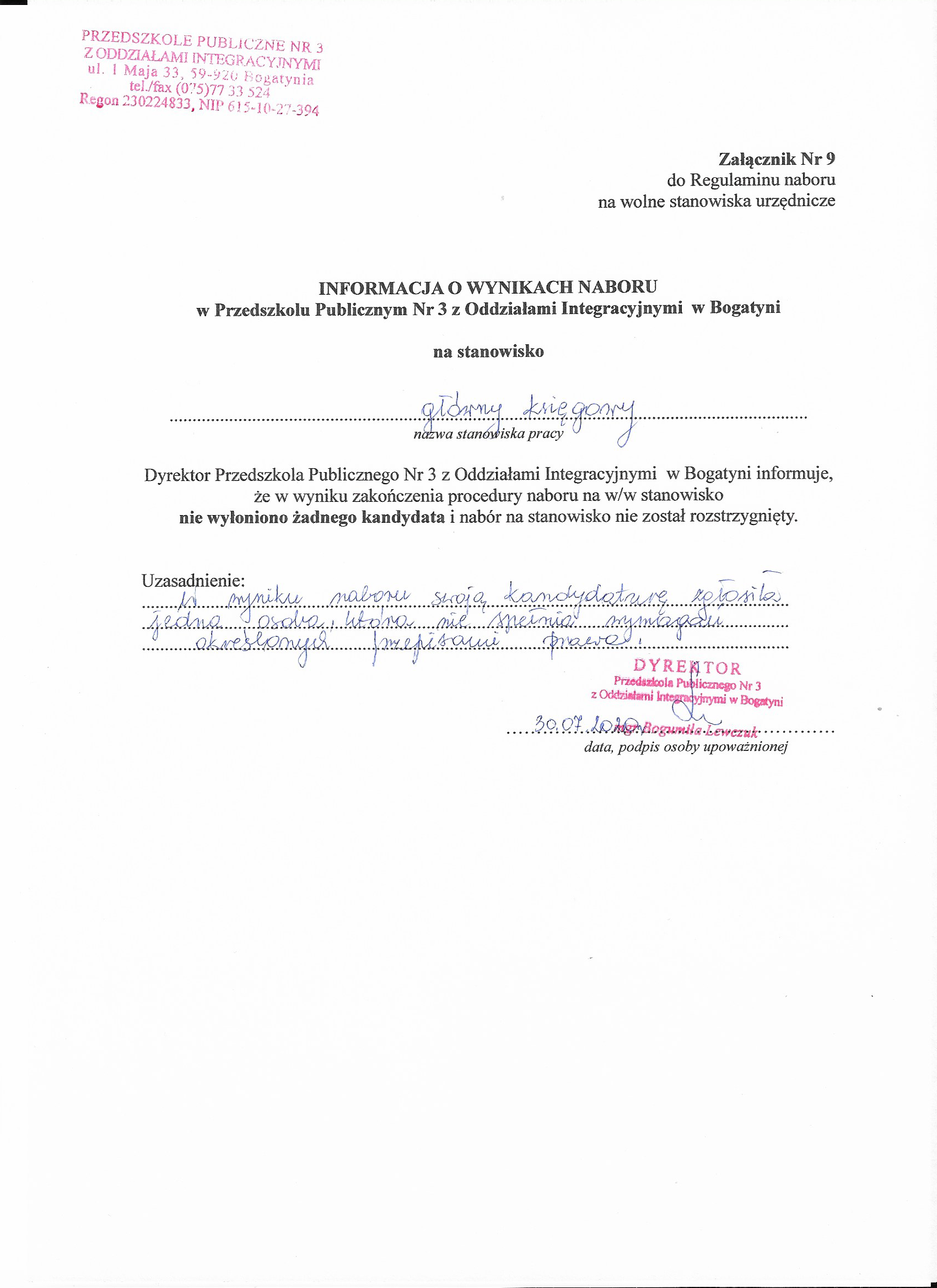 - Sposób składania dokumentów: osobiście lub listownie, w zamkniętych kopertach z dopiskiem: „Konkurs na stanowisko głównej księgowej w Przedszkolu Publicznym Nr 3 z Oddziałami Integracyjnymi w Bogatyni”;