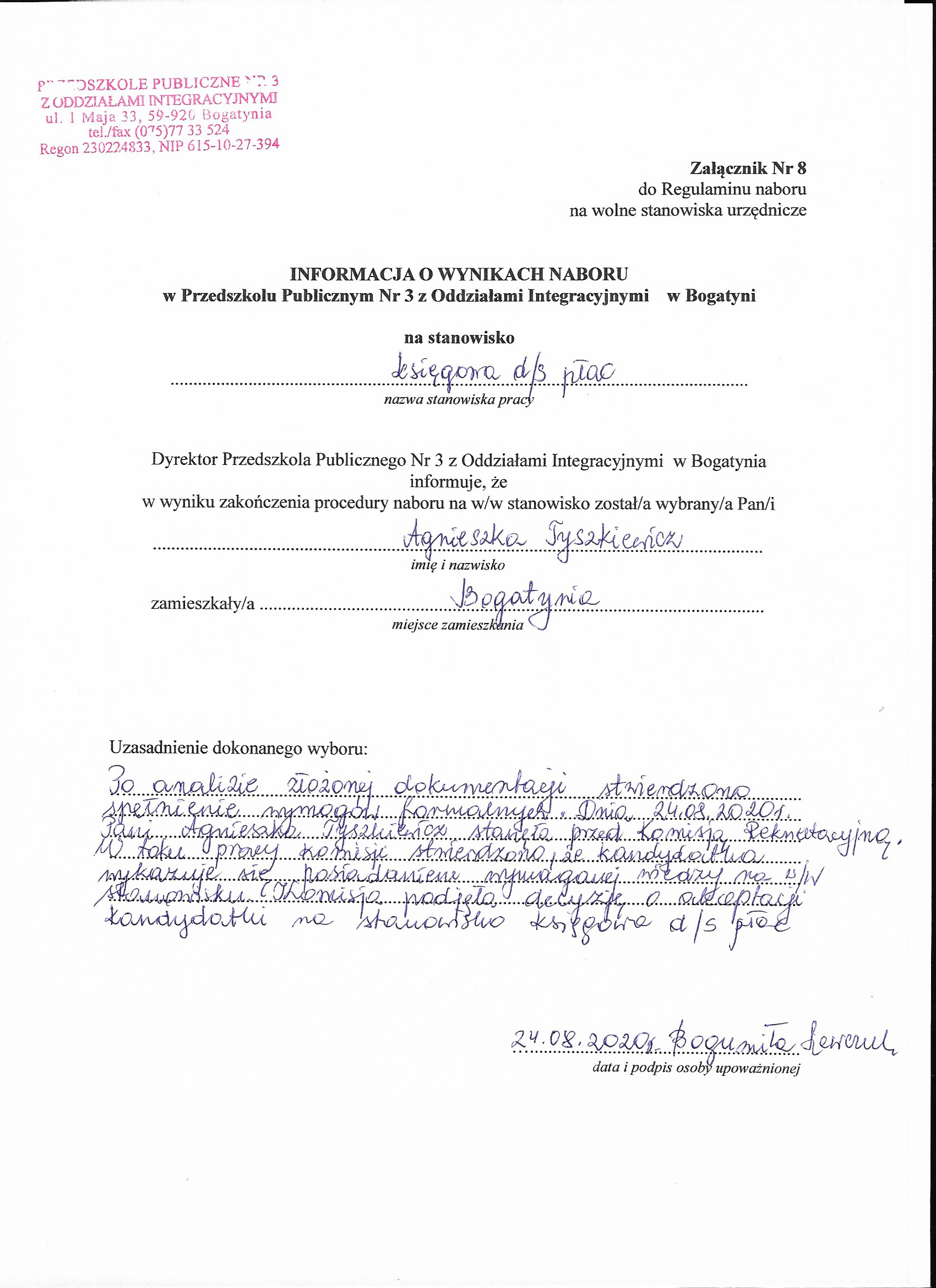 3. Z Regulaminem naboru można zapoznać się w siedzibie Przedszkola oraz na stronie  Biuletynu Informacji Publicznej www.bip.bogatynia.pl.