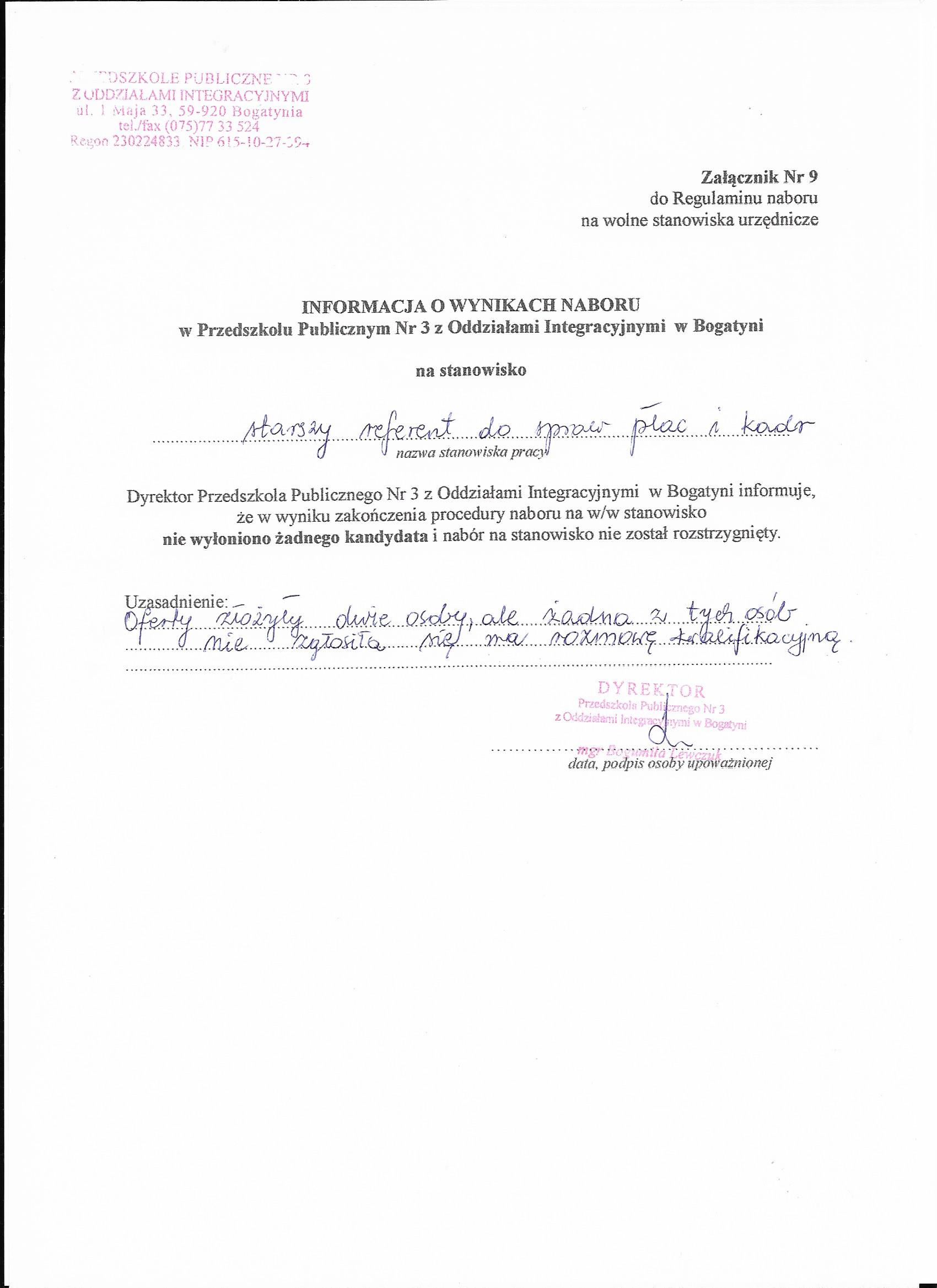 Dyrektor Przedszkola Publicznego Nr  3 z Oddziałami Integracyjnymi  w Bogatyni ogłasza nabór  na stanowisko : starszy referent ds. płac i kadr