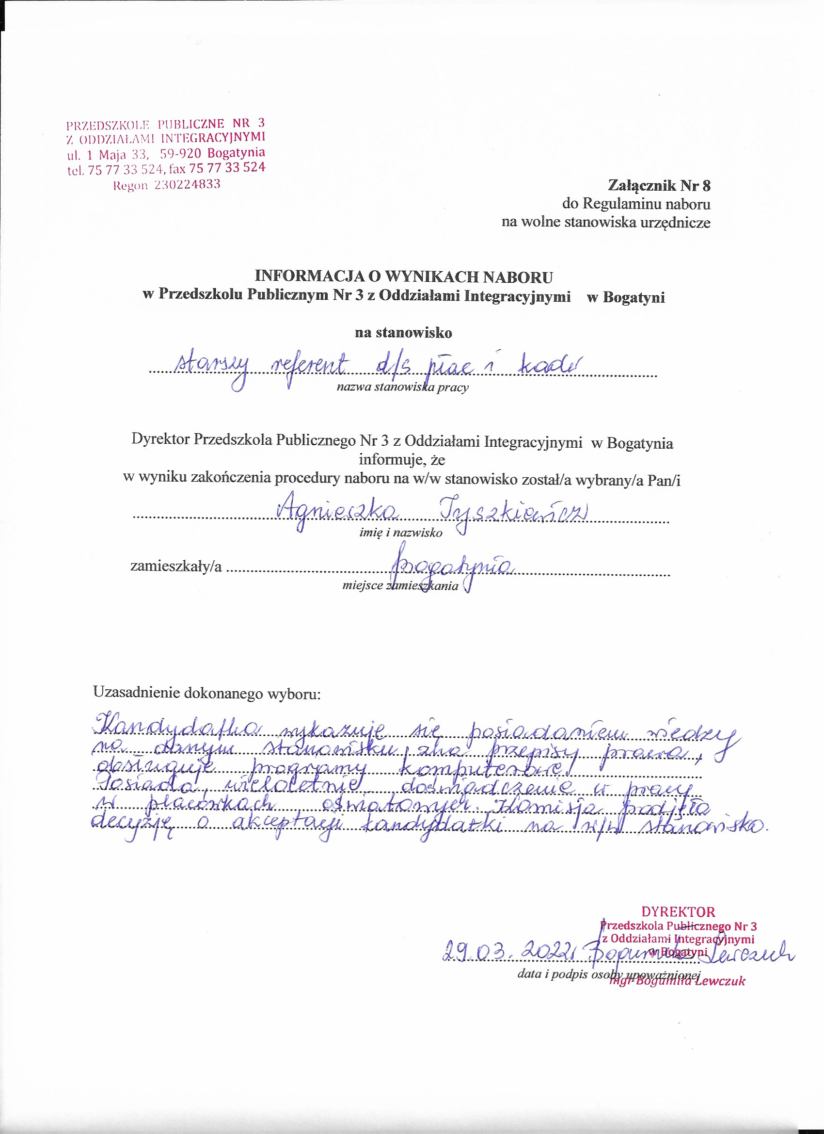 2. Sposób składania dokumentów: osobiście lub listownie, w zamkniętych kopertach z dopiskiem: „Konkurs na stanowisko   starszy referent ds. płac i kadr   w Przedszkolu Publicznym Nr 3 z Oddziałami Integracyjnymi  w Bogatyni”;